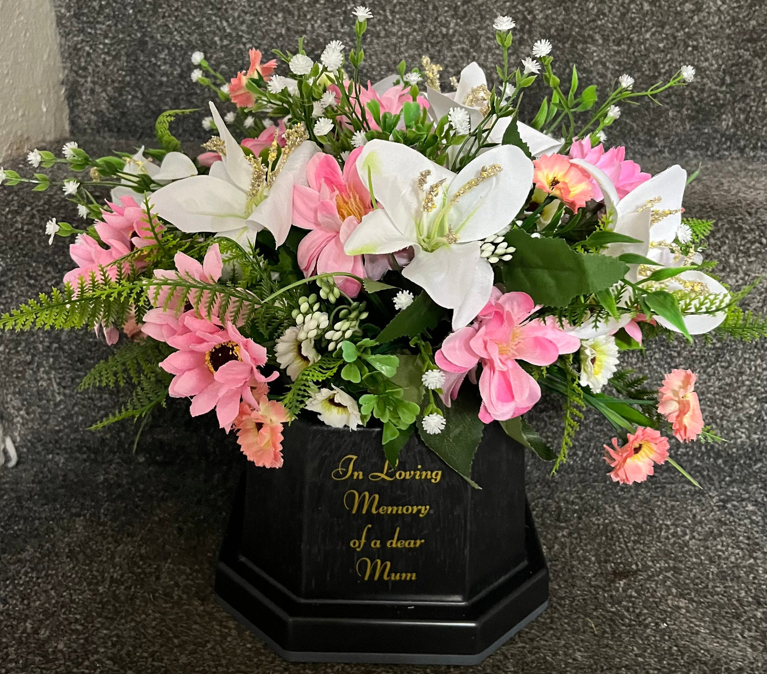 Each pot features lifelike, weather-resistant flowers carefully selected for their realism, colour, and durability. Whether you’re marking an anniversary, birthday, or simply paying your respects, our arrangements provide a dignified and heartfelt tribute that stays vibrant with no upkeep needed.